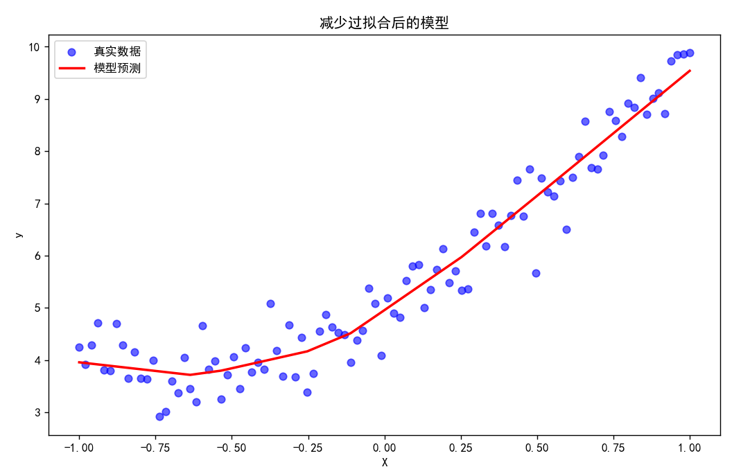 运行上述代码后,你将看到一个图像,其中: - 蓝色散点表示真实数据。 - 红色线条表示模型的预测结果。