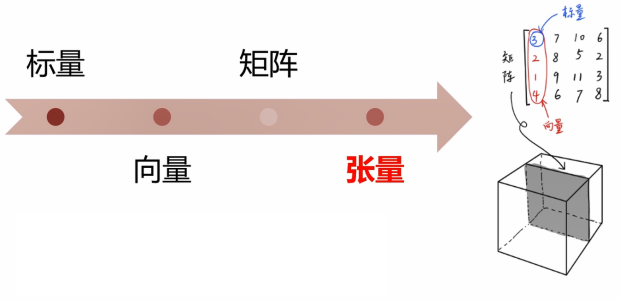PyTorch最基本的操作对象是Tensor(张量)。张量是一个数字容器,同时也是定义张量转换来生成新张量的一组规则。在数学中标量是只有大小没有方向的量;向量时有大小和方向的量;矩阵是由多个向量组成的。在PyTorch中标量就可以视为零阶的张量,向量可以视为一阶张量,矩阵就是二阶张量。