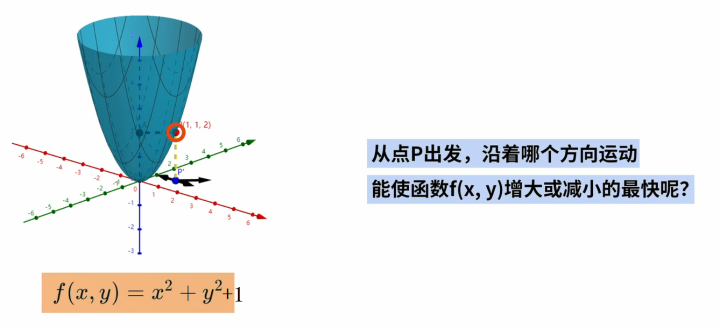为了快速找到这个曲面的最高点(最低点),我们就必须研究从P点出发沿着哪个方向运行能使得f(x,y)增大或者减少最快呢?