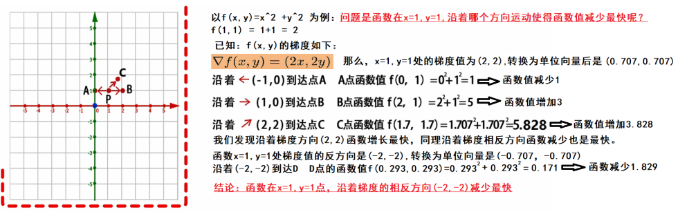 梯度的数学性质是:在函数上的某一点。 - 如果沿着函数梯度的方向运动,函数增加的最快。 - 如果沿着函数梯度的反方向运动,函数减小的最快。
