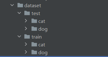 该数据集包含的训练集总共25000张图片,猫狗各12500张,带标签;测试集总共12500张,不带标签。我们仅使用带标签的25000张图片,分别拿出2500张猫和狗的图片作为模型的验证集。我们按照以下目录层级结构,将数据集图片放好。