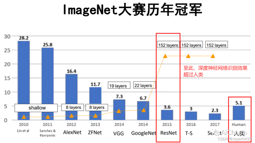 如果说你对深度学习略有了解,那你一定听过大名鼎鼎的ResNet,正所谓ResNet 一出,谁与争锋?现如今2022年,依旧作为各大CV任务的backbone,比如ResNet-50、ResNet-101等。ResNet是2015年的ImageNet大规模视觉识别竞赛(ImageNet Large Scale Visual Recognition Challenge, ILSVRC)中获得了图像分类和物体识别的冠军,是中国人何恺明、张祥雨、任少卿、孙剑在微软亚洲研究院(AI黄埔军校)的研究成果。