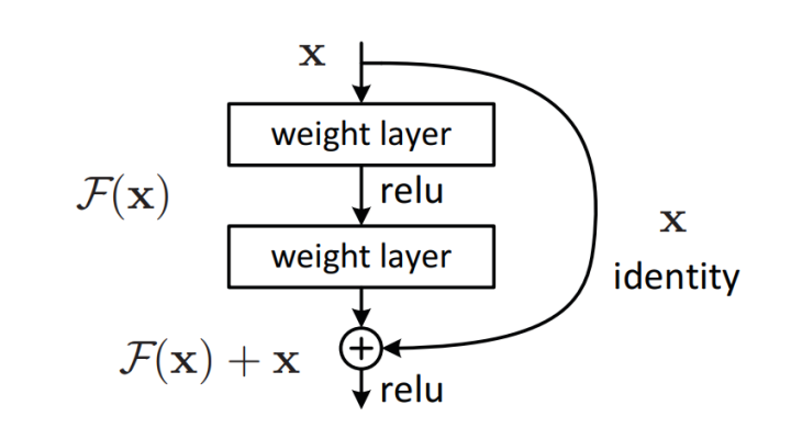 # 将输入 x 与卷积输出 out 相加,并通过 ReLU 激活函数
