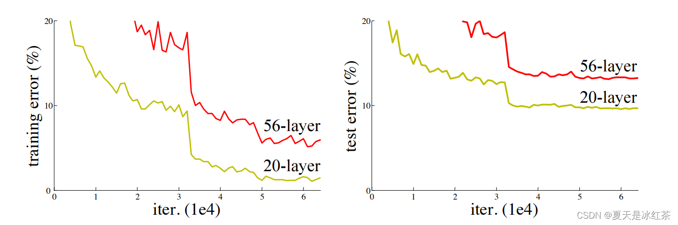 从上面两个图可以看出,在网络很深的时候(56层相比20层),模型效果却越来越差了(误差率越高),并不是网络越深越好。