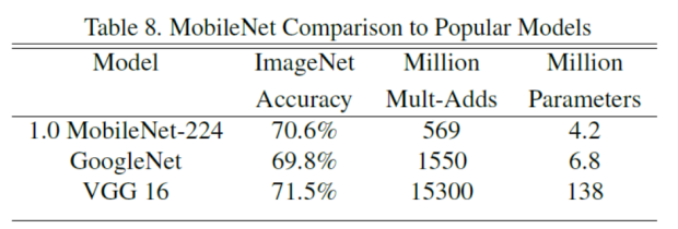 MobileNet与原始的GoogleNet和VGG16对比,MobileNet与VGG16有相似的精度,参数量和计算量减少了2个数量级。