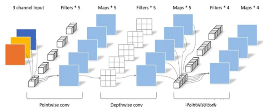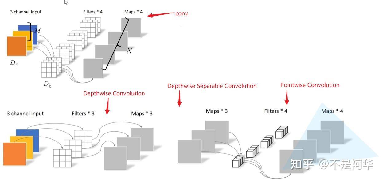 这里需要介绍一下深度可分卷积操作(Depthwise Separable Conv),这种卷积操作是有两种卷积组成的,即DW卷积和PW卷积(Pointwise Conv)组成,先DW卷积,结果作为PW卷积的输入,PW卷积如下图所示: