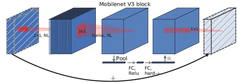 MobileNetV3的整体架构基本沿用了MobileNetV2的设计,采用了轻量级的深度可分离卷积和残差块等结构,依然是由多个模块组成,但是每个模块得到了优化和升级,包括瓶颈结构、SE模块和NL模块。MobileNetV3在ImageNet 分类任务中正确率上升了 3.2%,计算延时还降低了20%。