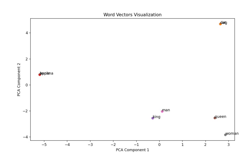 词向量的可视化: - 散点图中,语义相似的词(如“cat”和“dog”)会靠得更近,同理(如“apple”和“banana”)也会靠得更近,而语义不同的词(如“cat”和“apple”)会离得较远。 - 你还可以看到一些有趣的逻辑关系,比如“king”和“queen”之间的关系。