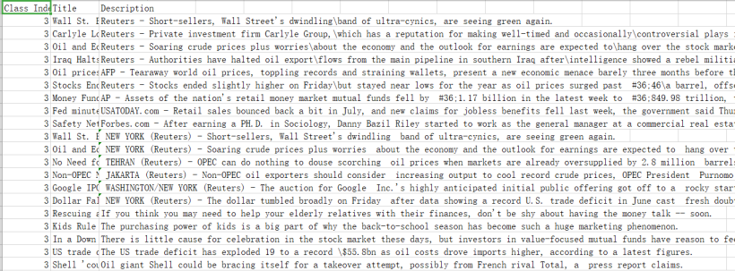 AG_NEWS:新闻语料库,包含4个大类新闻:World、Sports、Business、Sci/Tec。AG_NEWS共包含120000条训练样本集(train.csv), 7600测试样本数据集(test.csv)。每个类别分别拥有 30000 个训练样本及 1900 个测试样本。
