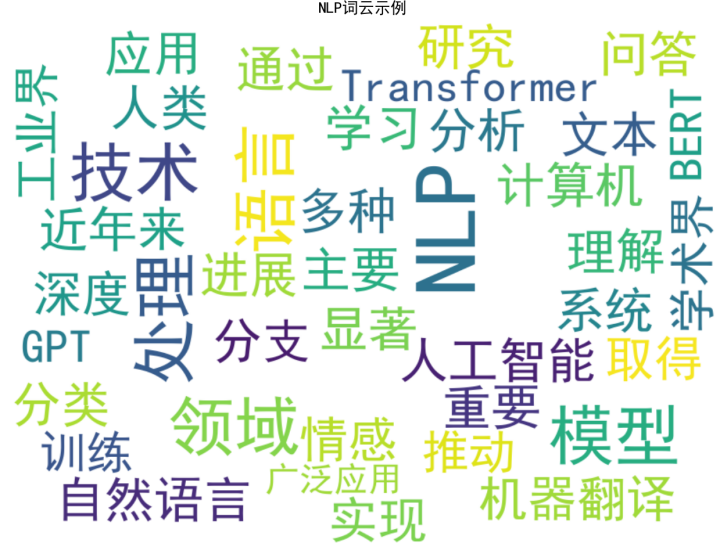 下面是一个使用 NLP 技术生成词云的简单案例代码。我们将使用 Python 的 jieba 库进行中文分词,wordcloud 库生成词云图,并结合 matplotlib 进行可视化展示。