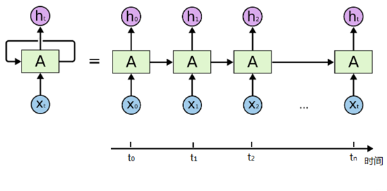 我们发现RNN比传统的神经网络多了一个循环圈,这个循环表示的就是在下一个时间步(Time Step)上会返回作为输入的一部分,我们把RNN在时间点上展开,得到的图形如下:
