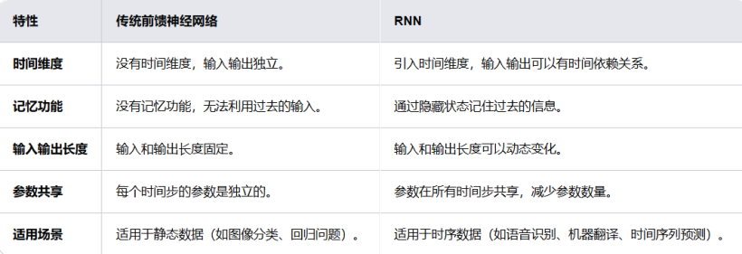 总结: RNN 的最大特点是它的 循环结构 和 记忆功能,这使得它能够处理序列数据中的时间依赖关系。时间序列预测是 RNN 的一个重要应用场景,但并不是它的唯一特点或最大特点。