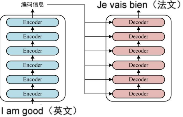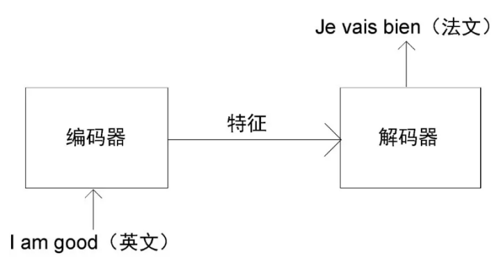 假设我们需要将一个句子 从英文翻译为法文。如下图所示,首先,我们需要将这个英文句子(原句)输进编码器。编码器将提取英文句子的特征并提供给解码器。最后,解码器通过特征完成法文句子(目标句)的翻译。