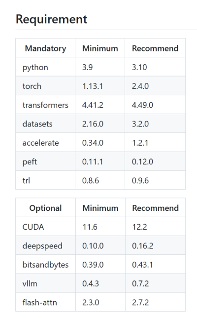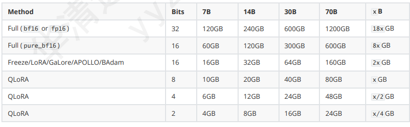 7B, 14B, 30B, 70B, x B: 表示不同大小的语言模型,这里的数字代表模型拥有的参数量(以十亿为单位)。例如,7B 表示拥有 70 亿参数的模型。 "x B" 是一个更大的未知参数量的模型。 Hardware Requirement (硬件需求): 表格中的数值表示在对应的微调方法、精度和模型大小下,估计所需的 GPU 内存大小(以 GB 为单位)。