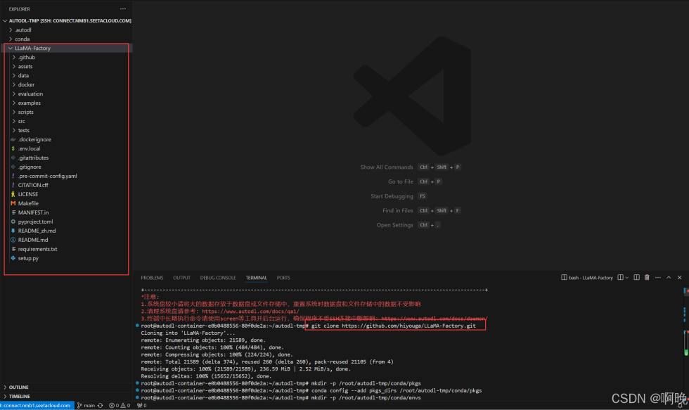 这里我使用 VS Code的 Remote-SSH 插件进行连接,连接进去之后可以看到实例中有两个盘,其中/root/autodl-tmp是数据盘,推荐运行环境、模型文件都放在数据盘,避免后续因为实例关机回收导致数据文件丢失。
