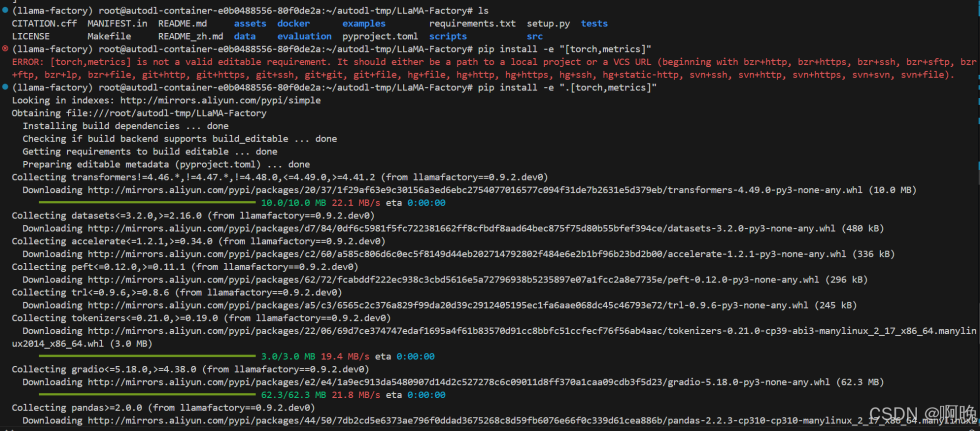 之后进入 LLaMa-Factory 文件夹,通过以下命令进行 LLaMa-Factory 相关依赖包的安装。