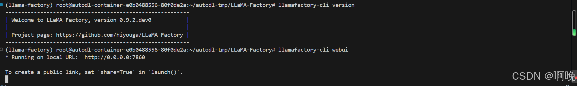 安装完成之后,通过以下命令测试一下 LLaMa-Factory 是否正常安装: