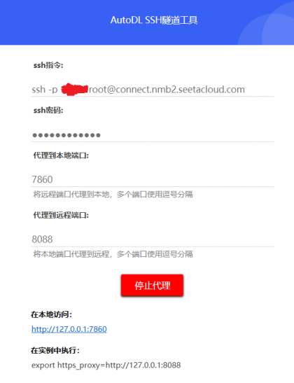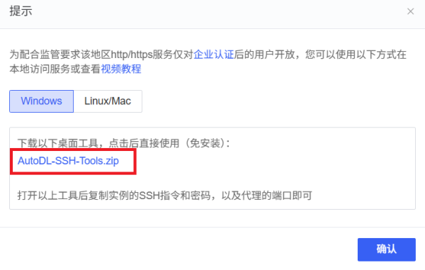 其他工具的话,需要安装AutoDL官网提供的网络穿透工具,才能实现端口转发。在实例界面选择:自定义服务。 下载网络穿透工具。