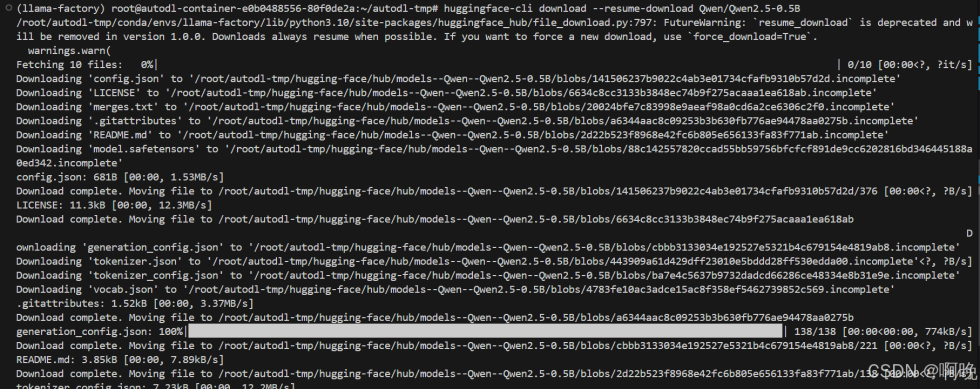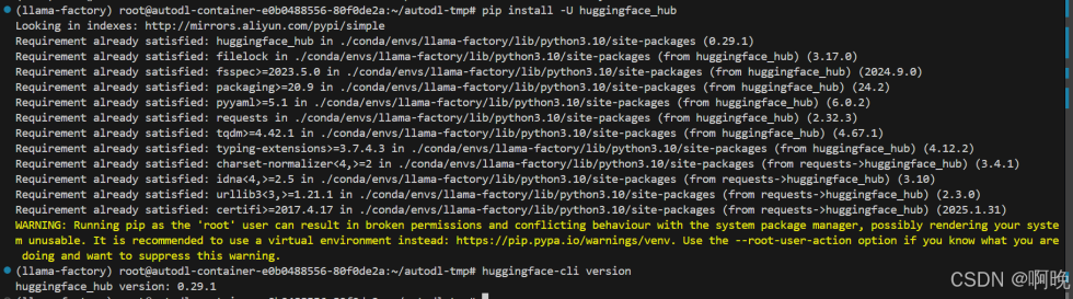 之后还是切换到 llama-factory 虚拟环境,安装 HuggingFace官方下载工具: