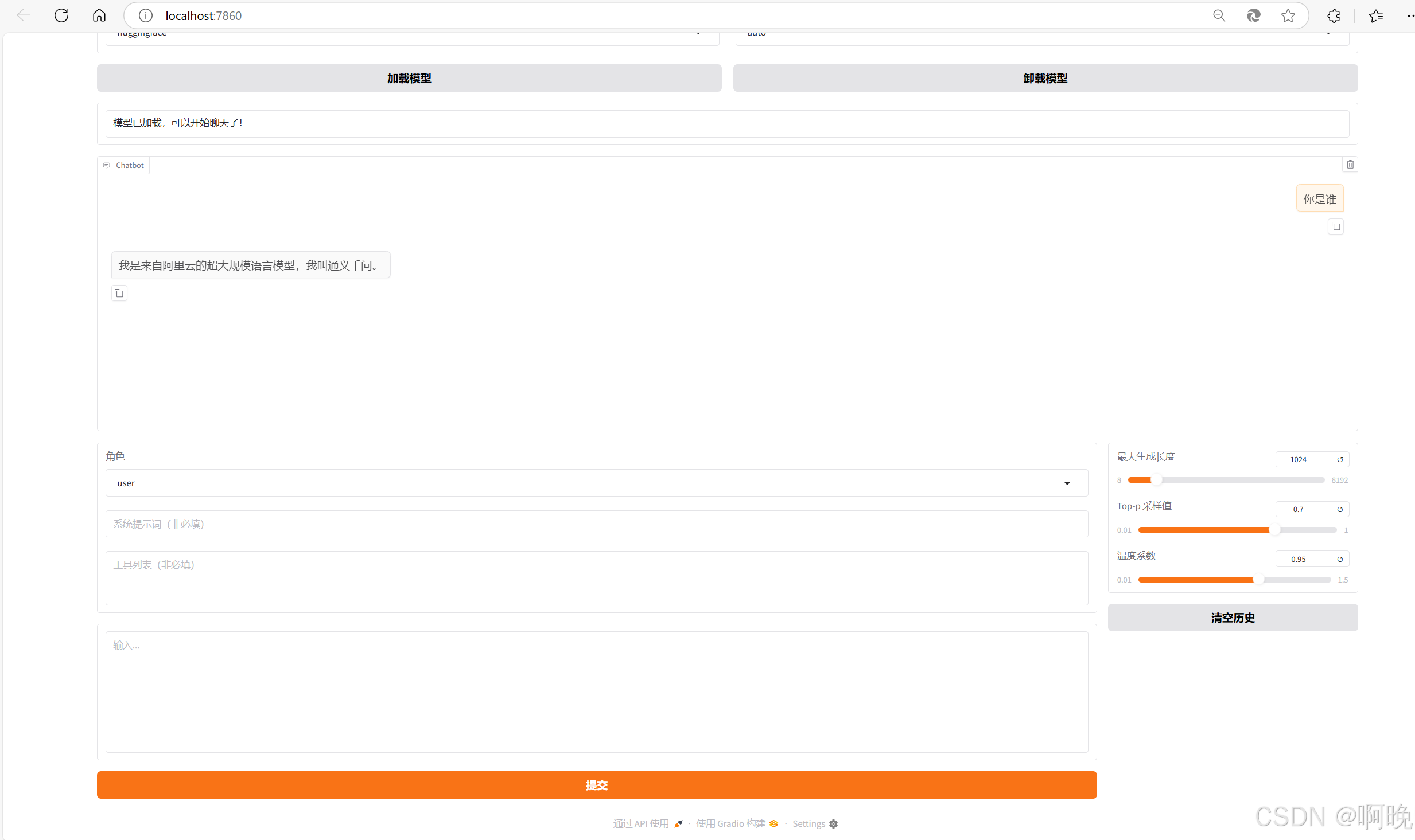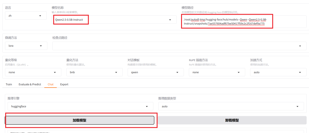 下载完成模型之后,我们需要验证模型文件是否可以正常加载、运行,可以通过 LLaMa-Factory 的可视乎界面加载运行模型: