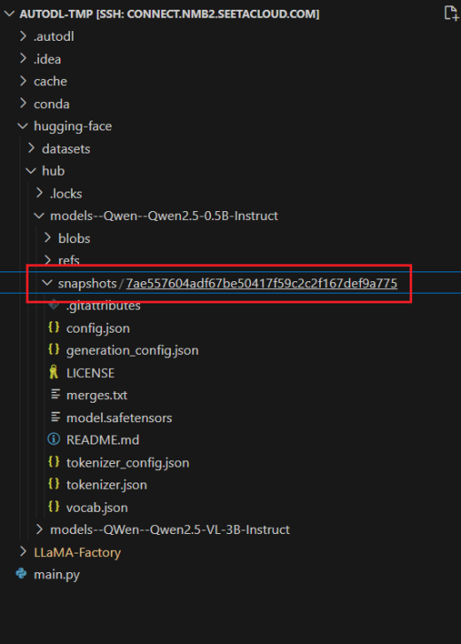 这里为了下载和后面的微调演示快点就下载0.5B的模型了,具体的模型大家可以根据实际情况去选择自己需要的模型,在huggingface上搜索模型名称,之后进入模型主页,复制名称即可。模型文件都比较大,在线下载的话需要等待一段时间,下载完成之后,可以看到模型文件就在 hugging-face 文件夹下了。