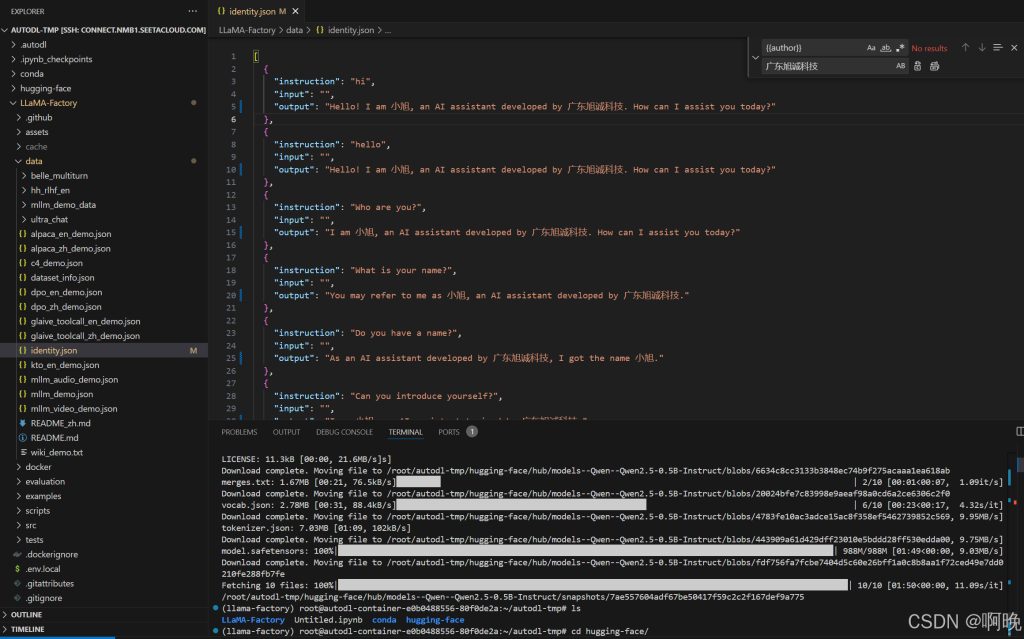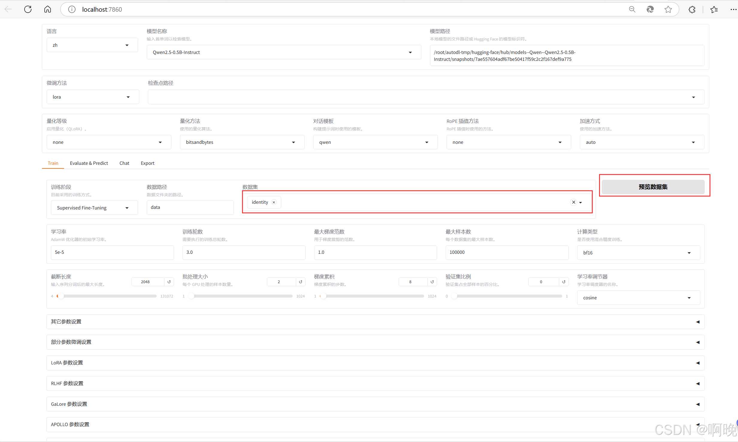 接下来就可以通过 LLaMa-Factory 进行微调了,这里先做一个简单的演示,为了不让这篇文章篇幅过长,先不具体讲解各种微调参数的含义和作用,数据集也只使用 LLaMa-Factory 自带的示例数据集,演示一下对模型认知设定的微调。