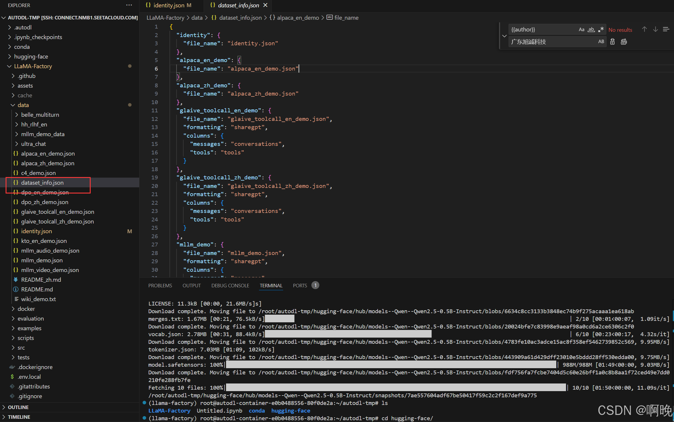 后续如果需要使用我们自定义的数据集的话,也只要将数据集文件放到 LLaMa-Factory 的 data 文件夹,再在 dataset_info.json 中进行配置,就可以在 Web 界面进行加载使用。这里就先展开细说了。