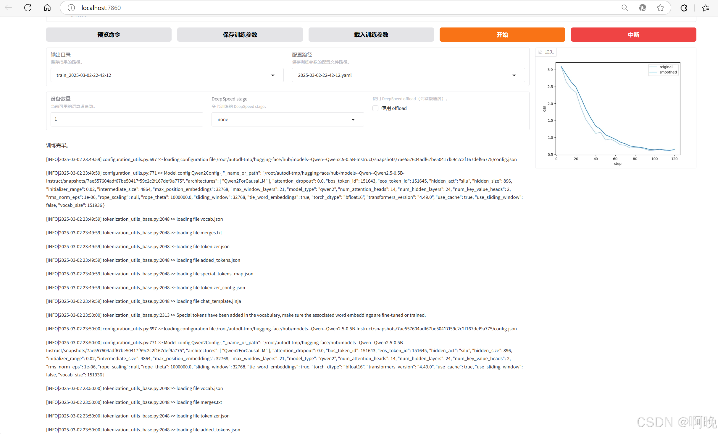 0.5B 的模型,再加上数据集数据量不多,只有不到100条,所以微调过程还是很快的,可以看到最终的损失函数降到了 0.5 左右。不过这是因为训练数据太少,而且一些超参设置比较不合理,才有这样的较低损失函数,实际微调用于生产环境的模型时,要注意防止过拟合的情况。