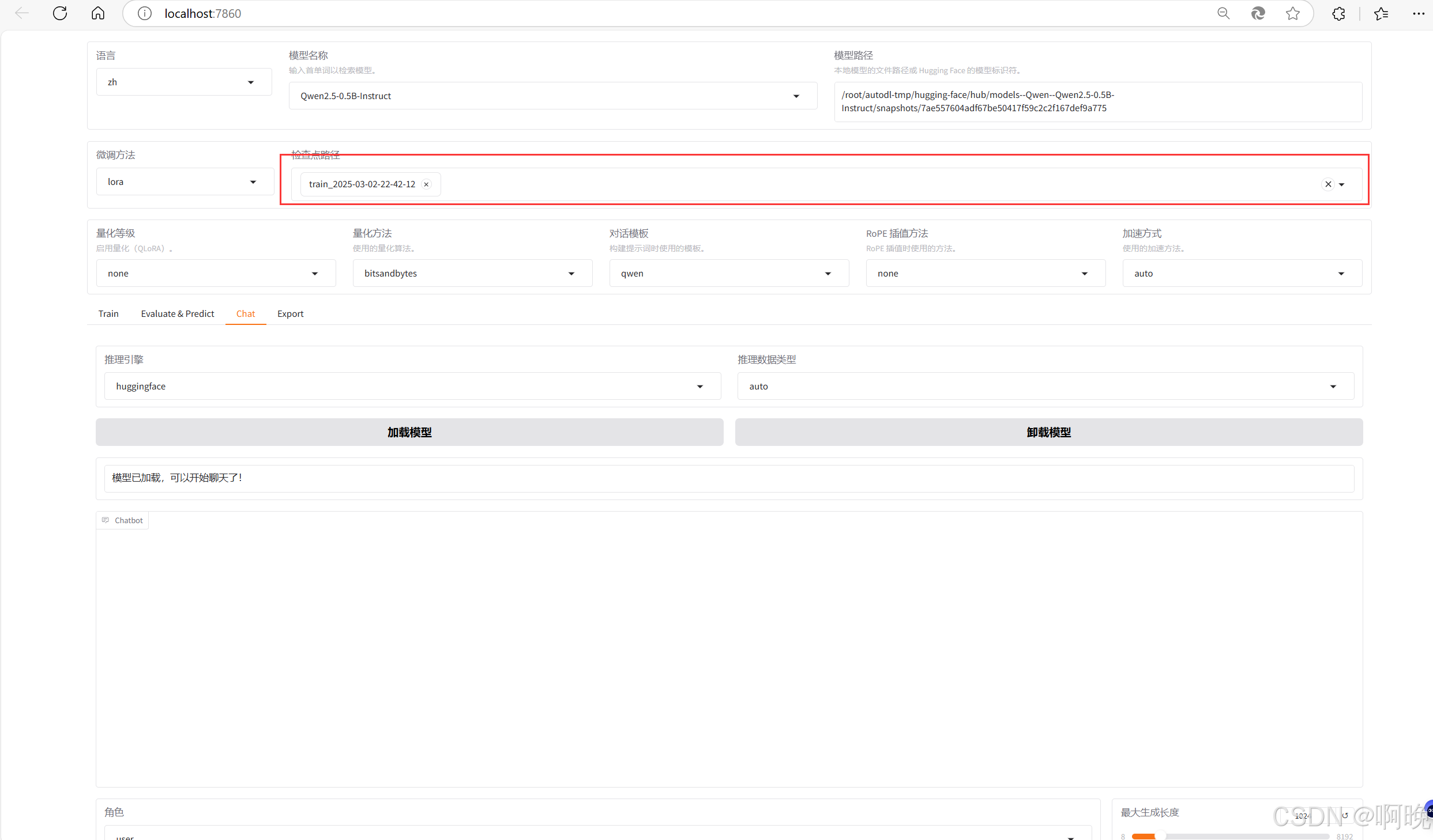 之后,还是用 LLaMa-Factory 加载微调之后的模型文件进行测试,这里通过检查点路径添加刚刚训练完成的模型文件:
