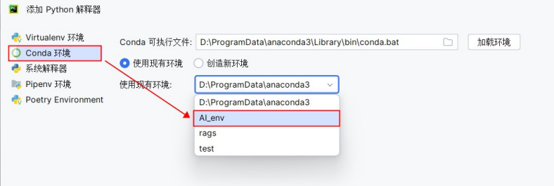 步骤3:在Pycharm中使用创建的环境 在设置中添加刚创建的虚拟环境。
