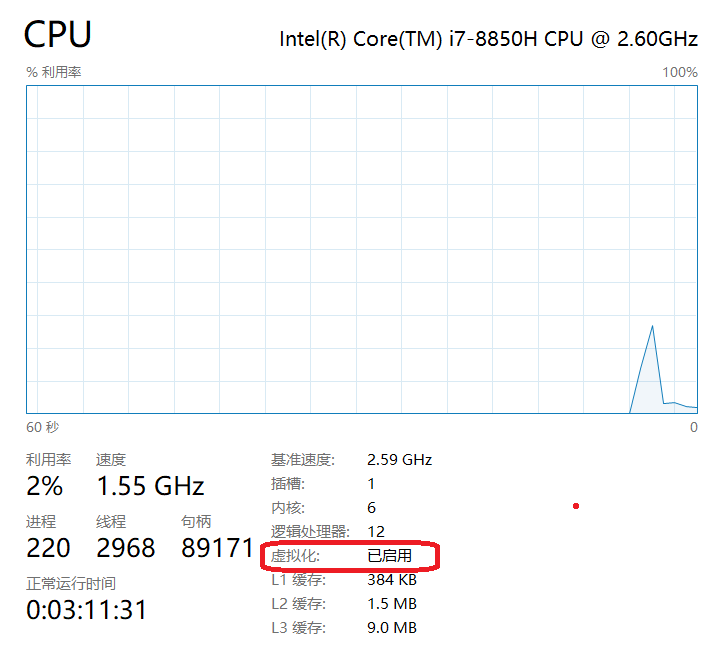 CPU虚拟化:CPU需支持且开启虚拟化,Win10和Win11一般默认开启CPU虚拟化,可通过下图方式查看是否开启了CPU虚拟化。