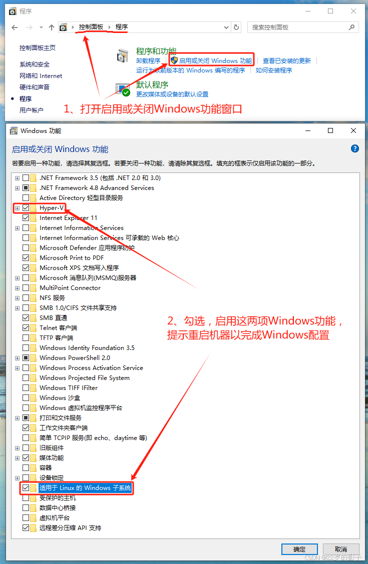 启用Windows功能:WSL和Hyper-V: