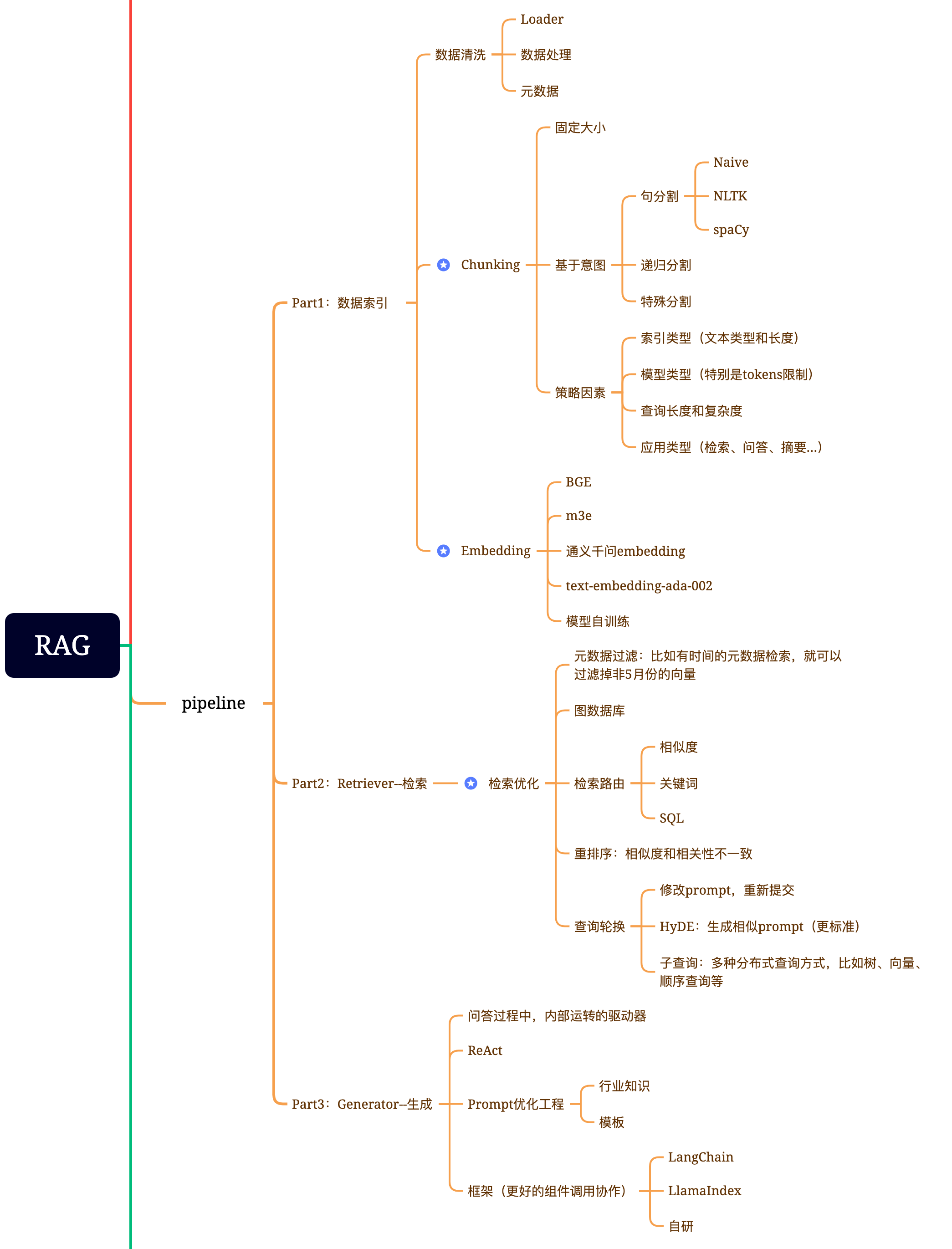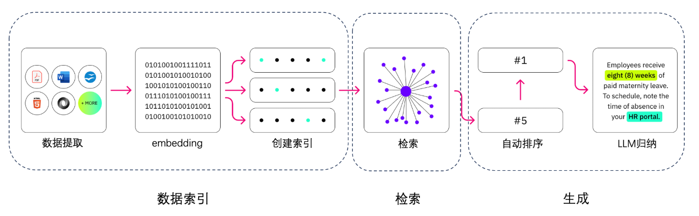 以下就是RAG的主要组成,依次是数据提取——embedding(向量化)——创建索引——检索——自动排序(Rerank)——LLM归纳生成。当然这里少了使用环节,我们暂时先忽略用户提问的环节。