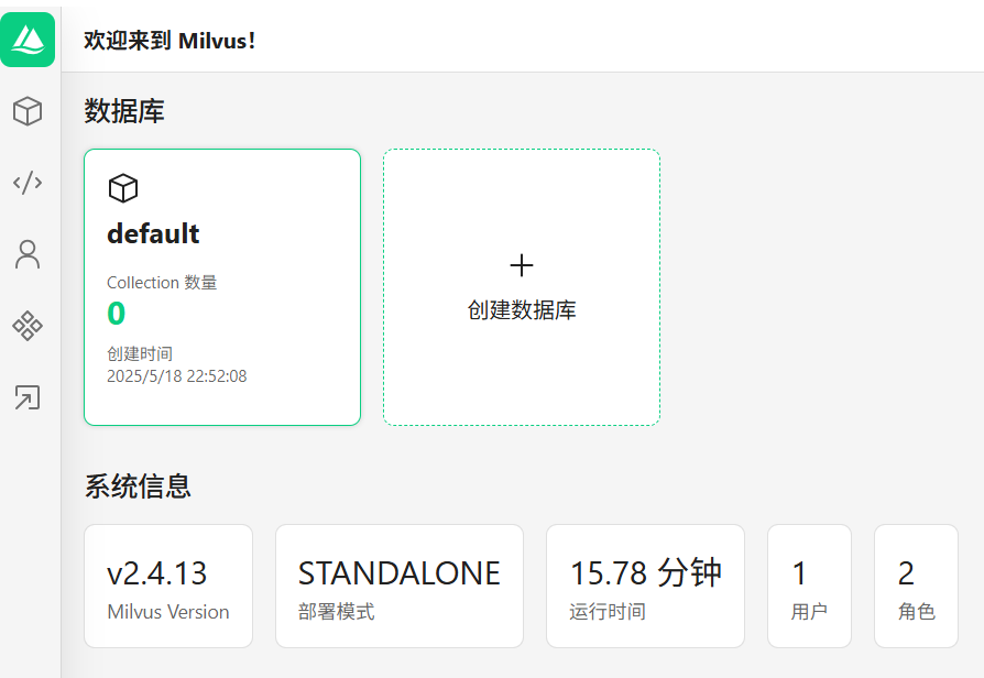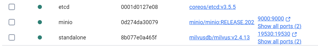 打开Docker Desktop,从下面信息可以看出,这个Docker环境中有四个正在运行的容器,分别与Milvus数据库服务、Etcd键值存储服务、MinIO对象存储服务相关联。“standalone”指的是一个独立运行的Milvus实例。