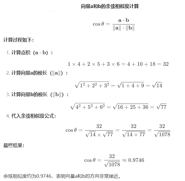 向量a是[1,2,3],向量b是[4,5,6],计算a和b的余玄相似度计算过程如下: