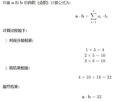 注意: 内积(点积)本身可以视为一种相似性度量,但它未归一化,因此受向量长度的影响(模长越大的向量,内积可能越大)。若需消除向量长度的影响,可用余弦相似度(如之前的问题),公式为:cosθ = (a·b) / (||a|| * ||b||) ,计算结果约为 0.9746,表示方向高度相似。
