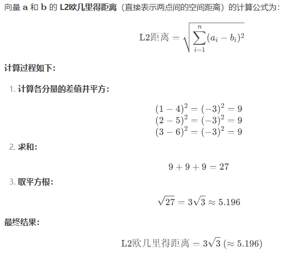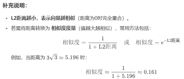 当计算两个向量的相似度时,常见的方法包括余弦相似度、内积和L2距离(欧几里得距离)。下面是每个方法的公式和示例计算。