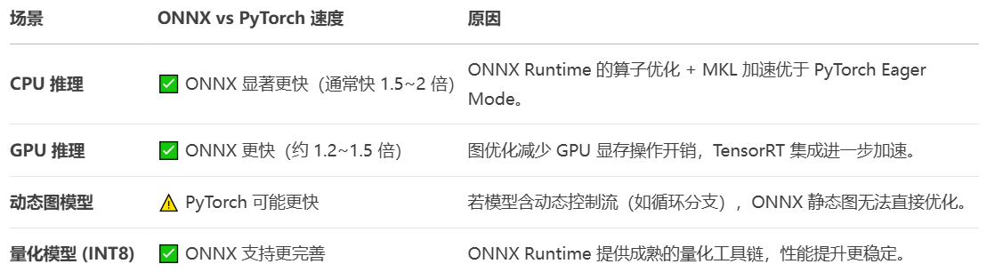 ONNX 与 PyTorch 原生模型(.pt/.pth)的推理速度对比,结论是:在大多数情况下,ONNX 模型经过优化后,推理速度会快于 PyTorch 原生模型,但这依赖于运行时环境、硬件加速库和模型结构。以下是详细分析: