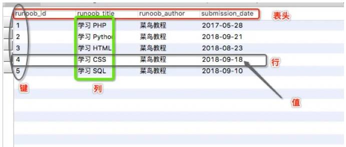 数据库(Database): 数据库是一些关联表的集合。 数据表(Table/Entity): 表是数据的矩阵。在一个数据库中的表看起来像一个简单的电子表格。 列(Field/Column): 一列(数据元素) 包含了相同类型的数据, 例如邮政编码的数据。 行(Record/Row):一行(=元组,或记录)是一组相关的数据,例如一条用户订阅的数据。 值 (Value):行的具体信息, 每个值必须与该列的数据类型相同; 主键(Primary Key):主键是唯一的。一个数据表中只能包含一个主键。你可以使用主键来查询数据。 外键(Foreign Key):外键用于关联两个表。 索引(Index):使用索引可快速访问数据库表中的特定信息。索引是对数据库表中一列或多列的值进行排序的一种结构。类似于书籍的目录便于快速查找。