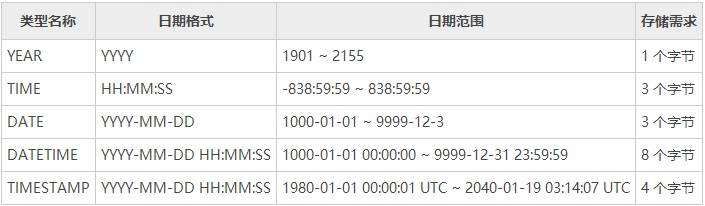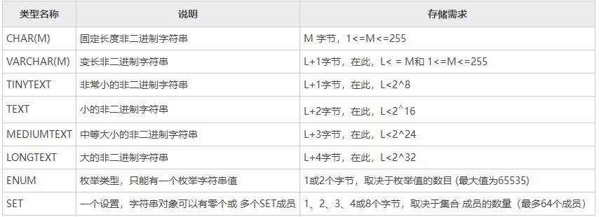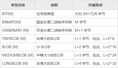 1) 数值类型 整数类型包括 TINYINT、SMALLINT、MEDIUMINT、INT、BIGINT,浮点数类型包括 FLOAT 和 DOUBLE,定点数类型为 DECIMAL。 2) 日期/时间类型 包括 YEAR、TIME、DATE、DATETIME 和 TIMESTAMP。 3) 字符串类型 包括 CHAR、VARCHAR、BINARY、VARBINARY、BLOB、TEXT、ENUM 和 SET 等。 4) 二进制类型 包括 BIT、BINARY、VARBINARY、TINYBLOB、BLOB、MEDIUMBLOB 和 LONGBLOB。