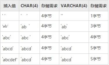 将不同的字符串保存到 CHAR(4) 和 VARCHAR(4) 列,说明 CHAR 和 VARCHAR 之间的差别,如下表所示。