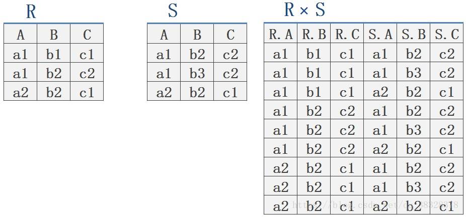 假设有关系R和S,则R和S的笛卡尔积结果如下: