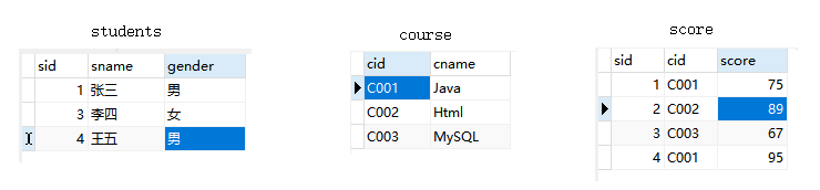 创建三张测试表,分别是学生表、课程表、考试成绩表。