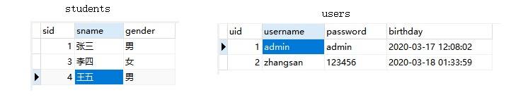 例如:如果students表中有sid为4的记录,那么将返回所有users表中的记录;否则,返回记录为空。 测试代码: