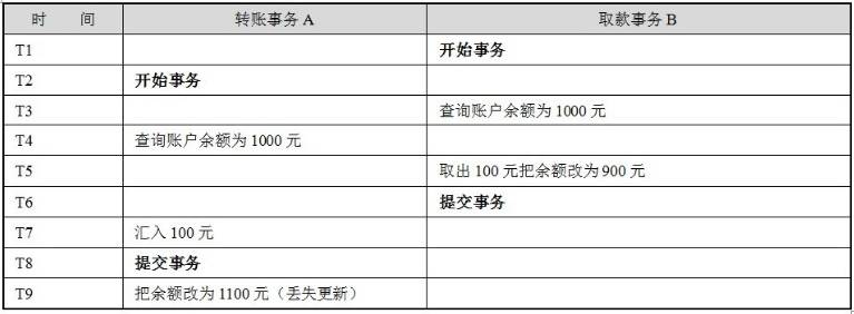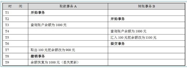 上面的例子里由于支票转账事务覆盖了取款事务对存款余额所做的更新,导致银行最后损失了100元,相反如果转账事务先提交,那么用户账户将损失100元。