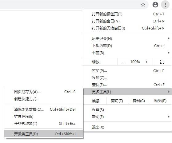 以Chrome浏览器为例,选择"更多工具"->"开发者工具",如下图所示:
