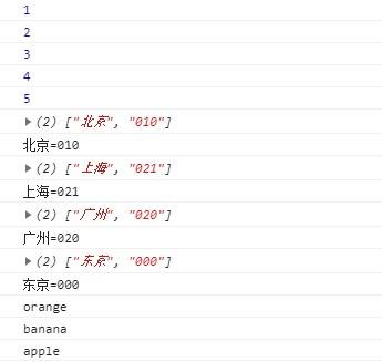 let map = new Map([['北京', "010"], ['上海', "021"], ['广州', "020"],['东京', "000"]]);