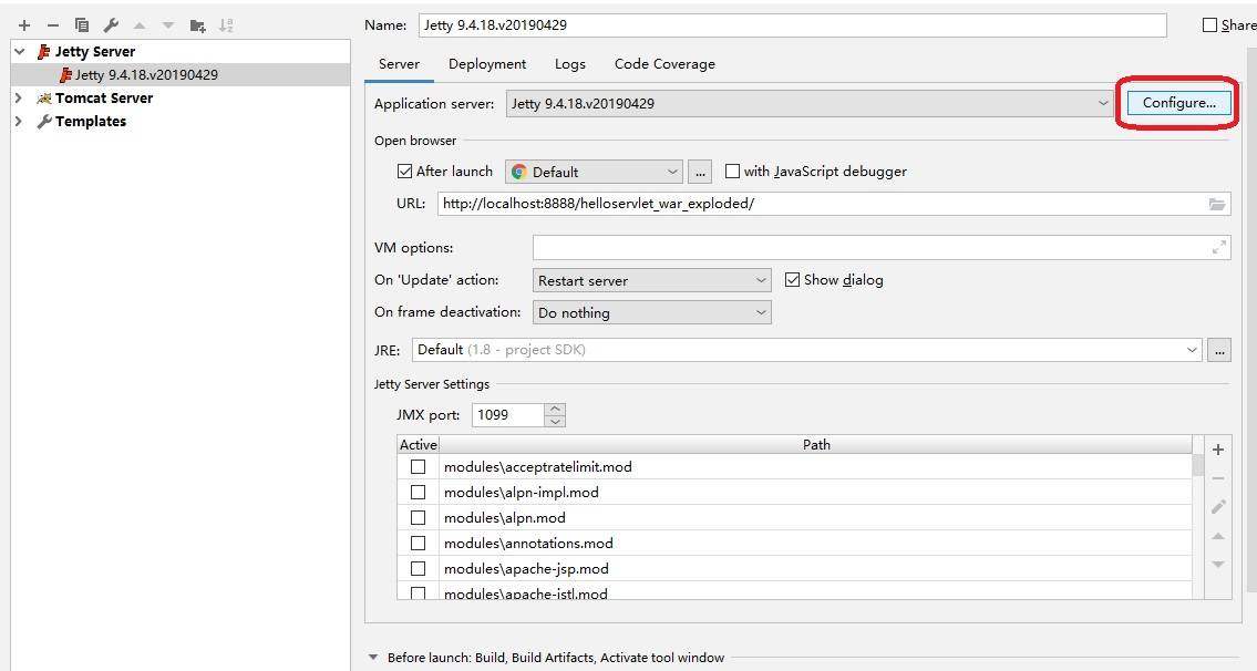 2)在窗口中选择Configure...,正确配置jetty的安装目录。