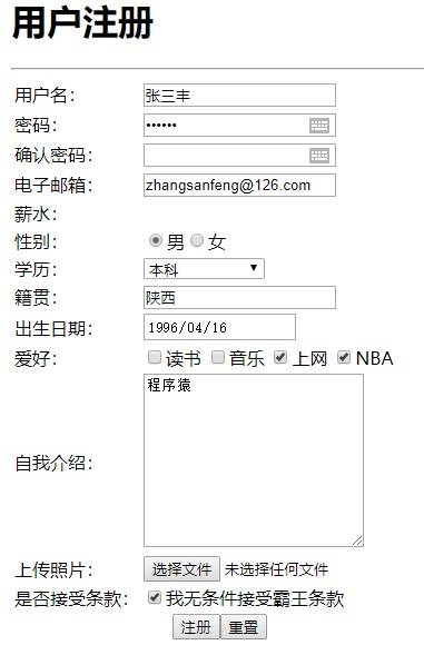 Users{username='张三丰', password='123456', email='zhangsanfeng@126.com', salary=10000.0, gender='M', education=5, province='陕西', birthday=Tue Apr 16 00:00:00 CST 1996, favorites=[internet, nba], introduce='程序猿', accept='true'}