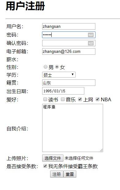Users{username='zhangsan', password='123456', email='zhangsan@126.com', salary=10000.0, gender='F', education=6, province='山东', birthday=Wed Mar 15 00:00:00 CST 1995, favorites=[internet, nba], introduce='程序猿', accept='true'}